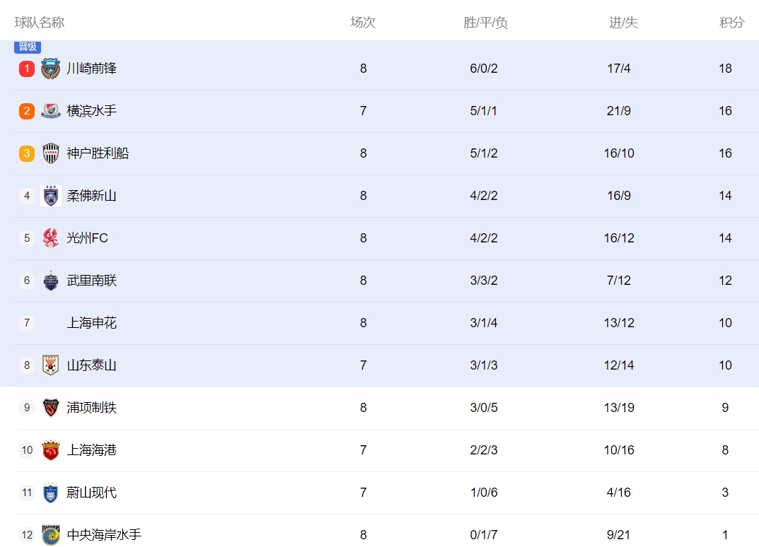 本赛季,中超、J联赛和K联赛各有三支球队参赛。从积分榜来看,J联赛依旧是东亚赛区领先的联赛,三支参赛球队获得了前三名,整体实力可见一斑。K联赛球队状态起伏不定,联赛冠军蔚山现代早早就已无出线希望,浦项铁人虽然赢下了与泰山等队的关键胜利,却在最后一轮惨败给武里南联,最终与晋级失之交臂,两支传统强队没落,反而名气并不响的光州FC却长期霸榜,最终名列第五晋级。