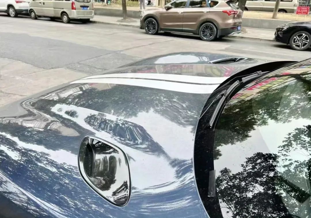 车尾部分,新车采用透明尾灯灯罩,搭配U型尾灯样式,后部小鸭尾上方设有后扰流板,后窗上方还有一个扰流板,后包围设计夸张,两侧配有导流槽,展现出强烈的运动感。尾部在车窗上部和后保险杠处还设有两个摄像头。