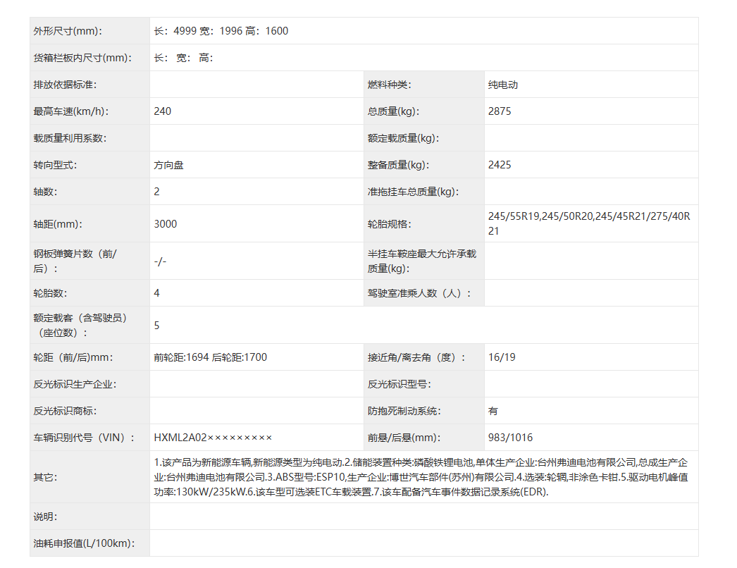 申报信息显示,该车辆三围分别为长 4999mm、宽 1996mm、高 1600mm,轴距 3000mm,整备质量 2425kg,前悬 / 后悬 983/1016mm,接近角 / 离去角 16/19 度,提供 245/55R19、245/50R20、245/45R21、275/40R21 轮胎可选,额定载客数 5 人。