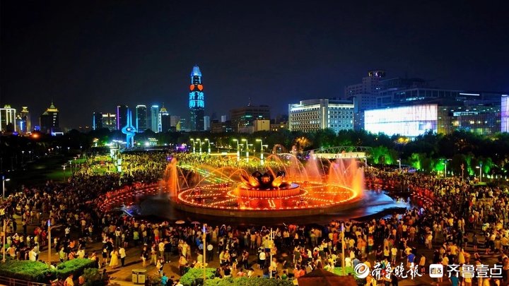泉城广场的喷泉随着音乐的节奏缓缓升起,水珠在空中划出美妙的弧线,折射出七彩的光芒,仿佛无数颗钻石在灯光下闪烁,孩子们在喷泉的水雾中奔跑嬉戏。