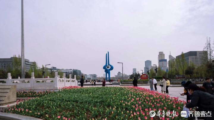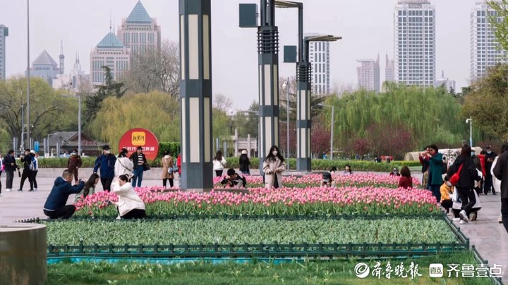 泉城广场上那片绚丽的郁金香,在春日暖阳中竞相绽放,像是大地的调色盘被打翻,洒下了一片斑斓的色彩。