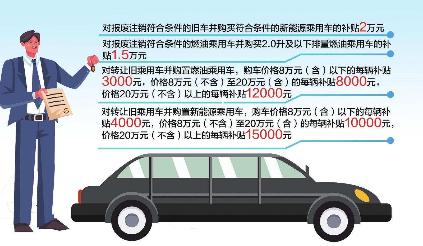 补贴标准方面,对转让旧乘用车并购置燃油乘用车,购车价格8万元(含)以下的每辆补贴3000元,价格8万元(不含)至20万元(含)的每辆补贴8000元,价格20万元(不含)以上的每辆补贴12000元;对转让旧乘用车并购置新能源乘用车,购车价格8万元(含)以下的每辆补贴4000元,价格8万元(不含)至20万元(含)的每辆补贴10000元,价格20万元(不含)以上的每辆补贴15000元。购置价格以机动车销售统一发票中的价税合计数为准。转让的旧乘用车应于2025年1月8日(含当日,下同)前登记在申请人名下(以《机动车登记证书》记载时间为准)。每名消费者在一个自然年度内最多可享受一次汽车置换更新补贴。