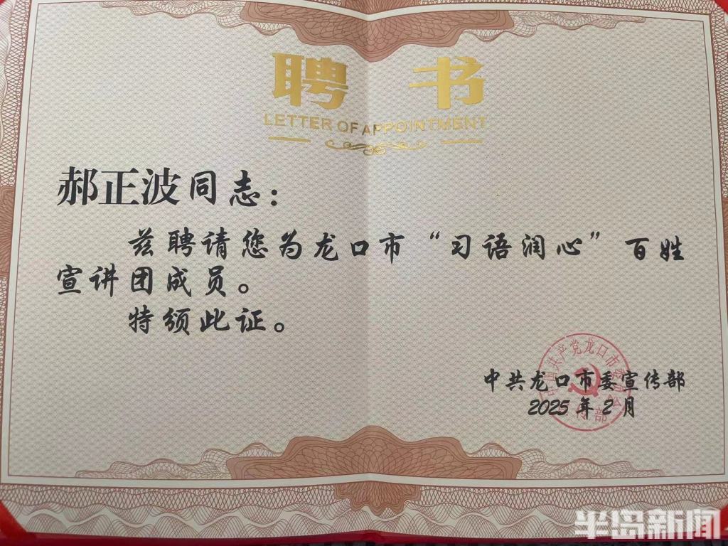 得知郝正波因救人腿部冻伤,龙口市委宣传部相关负责人关切询问其身体状况,并为郝正波献上鲜花,同时颁发“龙口市‘习语润心’百姓宣讲团”聘书,邀请郝正波通过身边人讲身边事的方式,传递社会正能量。