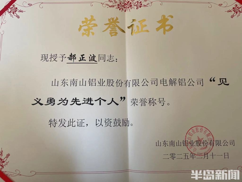 21日上午,电解铝公司不但为郝正波颁发了“见义勇为先进个人”证书,还奖励其万元现金。
