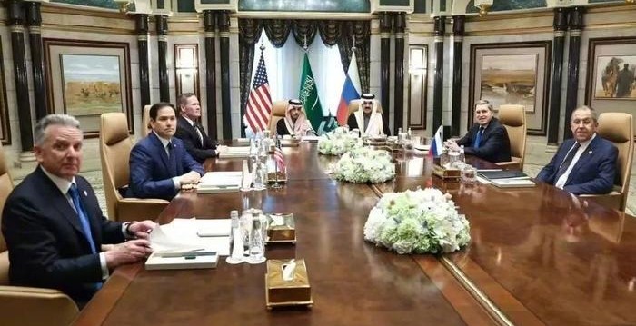 2月18日,在沙特首都利雅得,美国国务卿鲁比奥(左二)与俄罗斯外长拉夫罗夫(右一)举行会谈。(央视新闻)