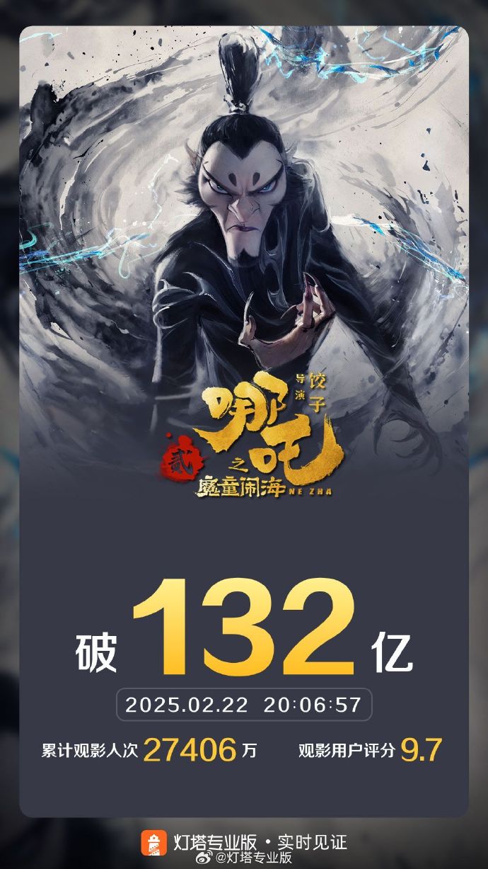 据灯塔专业版实时数据,截至2月22日20时6分,影片《哪吒之魔童闹海》票房突破132亿。