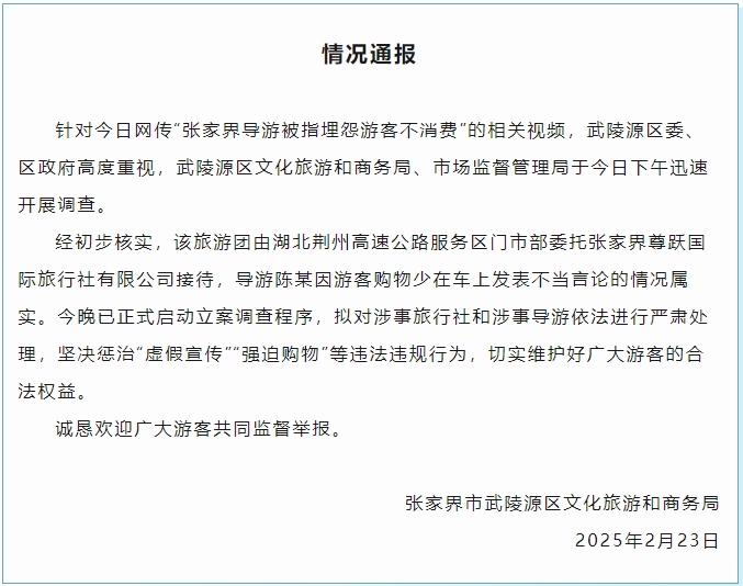 针对网传的“张家界导游被指埋怨游客不消费”的相关视频,武陵源区委、区政府高度重视,武陵源区文化旅游和商务局、市场监督管理局于2月23日下午迅速开展调查。