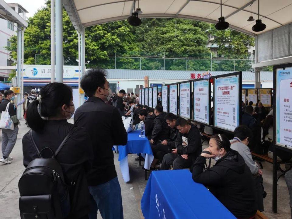 在海珠区零工市场(康鹭新招工广场),像阿丽这样的求职者还有很多,现场氛围十分火热,交流互动情绪高涨。招聘会岗位优质、薪资待遇可观,吸引了众多求职者驻足投递简历,并与用工方现场看款式、聊面试。