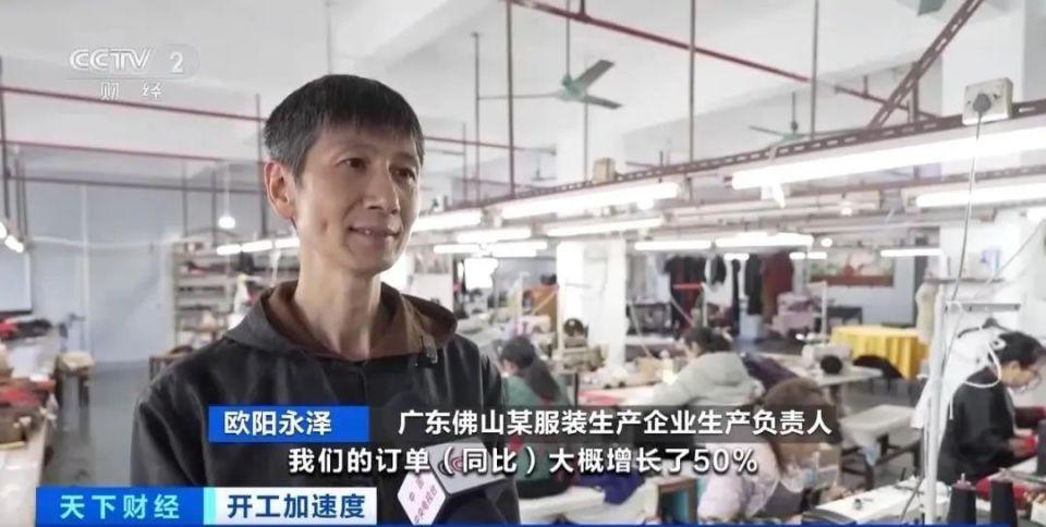 广东佛山某服装生产企业生产负责人欧阳永泽表示:“我们开工提前了一周。今年一月份到现在,我们的订单同比大概增长了50%。现在我们工人缺口还是蛮大的。”