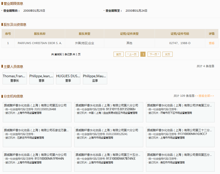 国家企业信用信息公示系统显示,路威酩轩香水化妆品(上海)有限公司成立于2000年,由法国企业PARFUMS CHRISTIAN DIOR S. A.全资持股,法定代表人为Thomas,Francois,Jean BAUDRY。据悉,路威酩轩是一家化妆品品牌代销商,旗下代理涵盖Dior、Guerlain、Givenchy、Benefit、Kenzo等品牌产品。