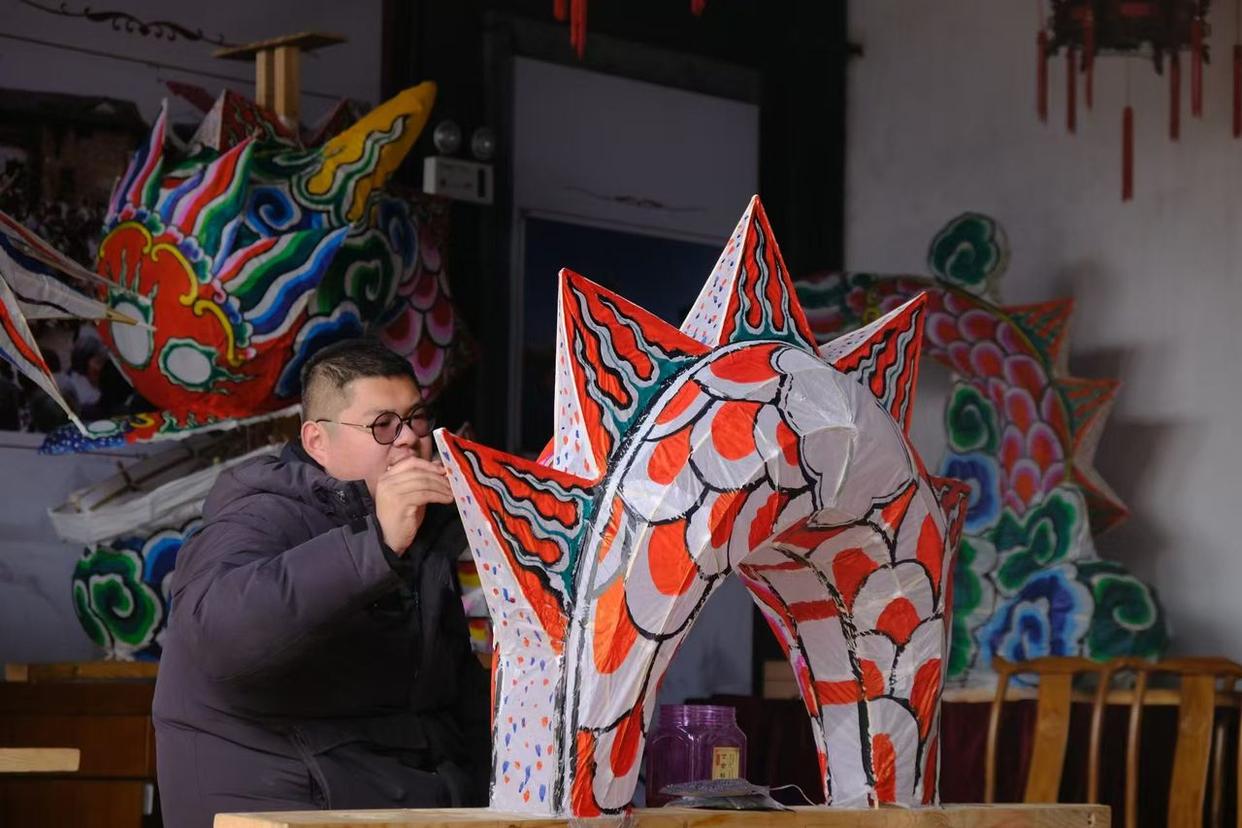 每年过年,舞龙是金华东阳必不可少的仪式。制作龙灯的手艺人在这段时间尤为忙碌,00后小伙左炎令便是其中一位。他经营“吴宁兴记”灯店,今年春节有七条由他设计制作的龙灯亮相东阳街头。
