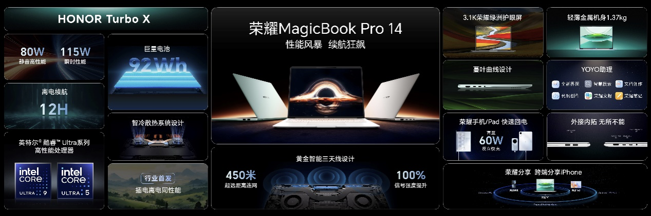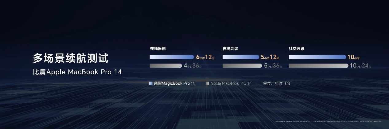 在HONOR Turbo X开启下,荣耀MagicBook Pro 14多场景续航表现为:在线会议5小时12分、在线追剧6小时12分、社交通讯10小时,比肩苹果MacBook Pro 14(M4 Pro),首次见证x86笔记本续航里程碑时刻。