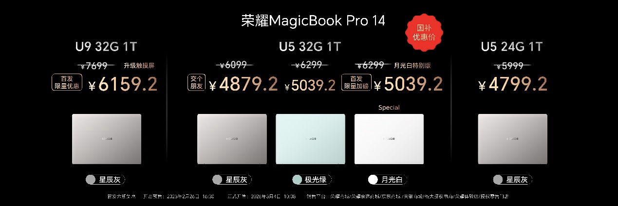 荣耀MagicBook Pro 14为消费者提供多种配置选择,Ultra5+24GB+1TB国补到手价4799.2元,Ultra5+32GB+1TB国补到手价4879.2元,Ultra9+32GB+1TB触控屏版到国补手价6159.2元,于2月26日16:30开启预售,3月4日10:08正式开售。