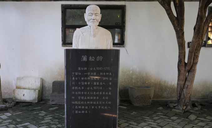 如今,在宝应县衙门遗址东侧,蒲松龄曾经居住过的两层小楼的三合院被辟为蒲松龄游幕宝应纪念馆。一楼设有“鹤轩流芳——蒲松龄游幕宝应觅踪”主题展厅,一尊蒲松龄半身铜像静静伫立。二楼东西两侧的厢楼是蒲松龄当年办公、创作的地方。此外还建有“鹤苑”,巧妙引用蒲松龄游幕宝应相关的鹤轩、鹤亭、鹤泉、放生池碑记等元素以及蒲松龄故居藤廊等人文景致,别具一格,独具情趣。