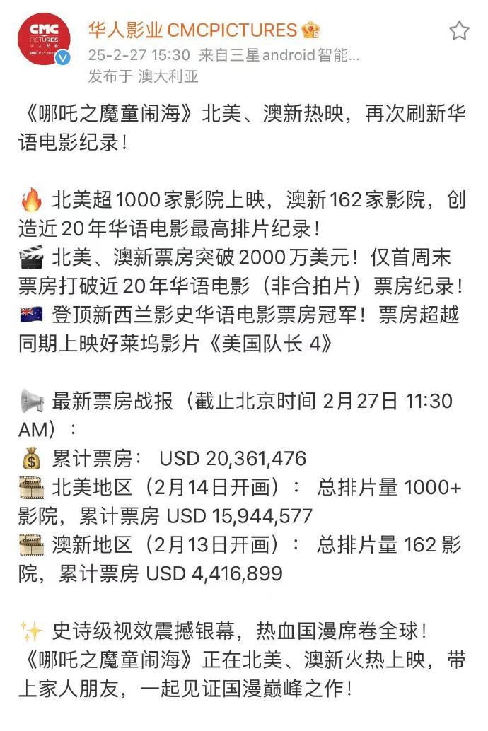 同日,@华人影业CMCPICTURES 发出哪吒2北美、澳新新成绩,其中提到了《哪吒之魔童闹海》 北美超1000家影院上映,澳新162家影院,创造近20年华语电影最高排片纪录!