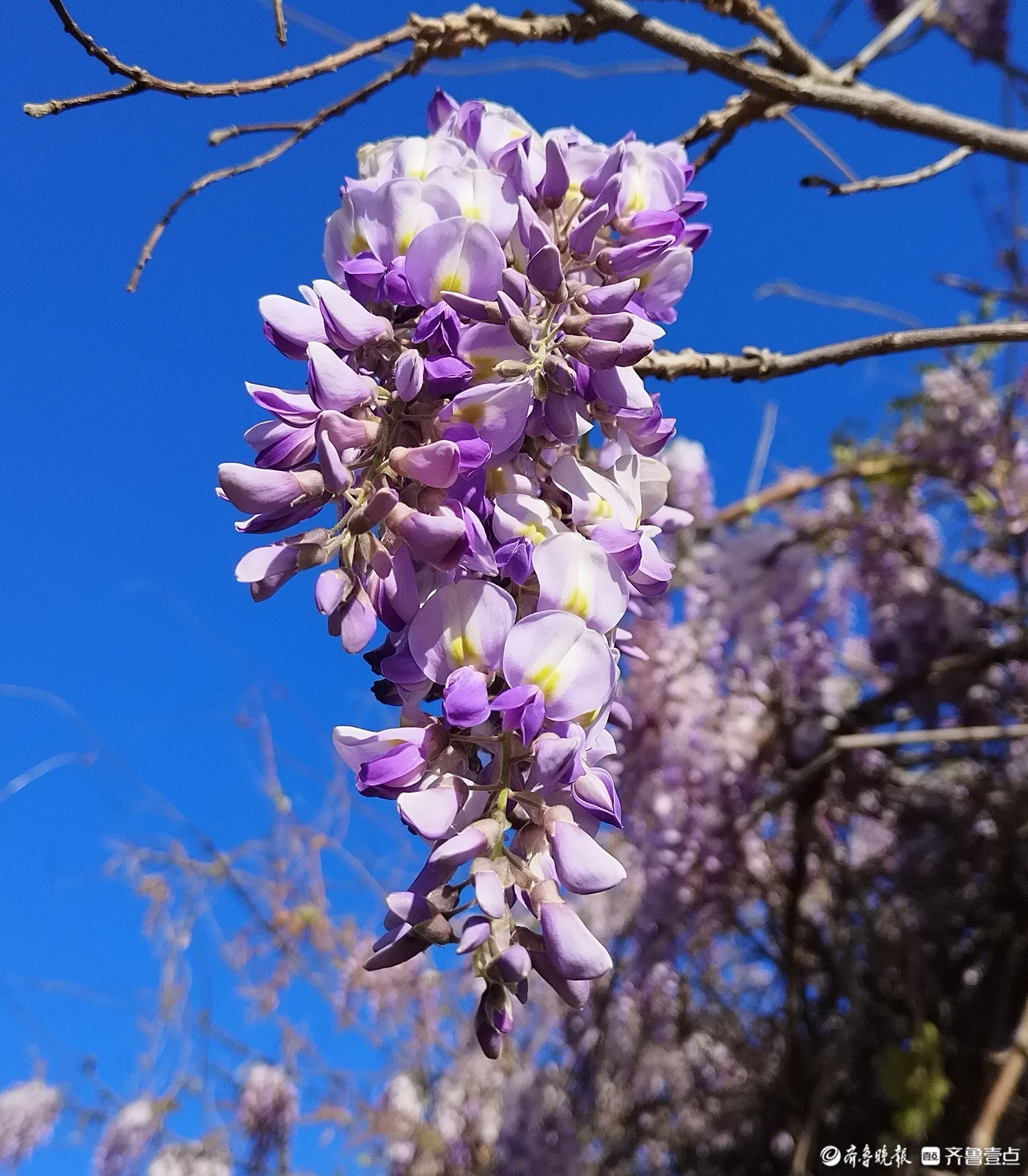 棚架垂坠紫色花穗,烂漫优美,芳香袭人。依依的思念。诗词有“四座风香春几许,庭前十丈紫藤花”“紫藤挂云木,花蔓宜阳春。密叶隐歌鸟,香风留美人”。