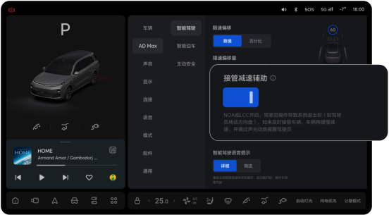 理想汽车持续通过优化人机交互提升智能驾驶的安全性,强调用户监督的重要性。AD Max新增“接管减速辅助”和“高速NOA自主变道提示”功能。其中,接管减速辅助功能优化了用户接管方向盘后的功能逻辑、交互样式和障碍物制动能力。开启“接管减速辅助”后,驾驶员转动方向盘接管车辆时,车辆将缓慢减速,并伴随全新交互提示,刹停后将会自动亮起双闪,该过程中驾驶员可以踩刹车或油门随时退出功能。