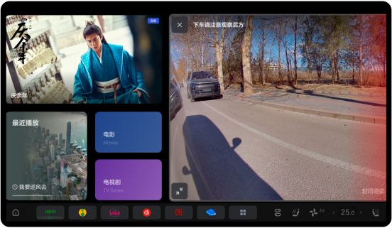 智能座舱新增副驾下车卫士来车提醒功能,当副驾用户开门遭遇后方速度大于5km/h的二轮车或者机动车接近时,副驾屏幕视频窗口边框泛红提醒。