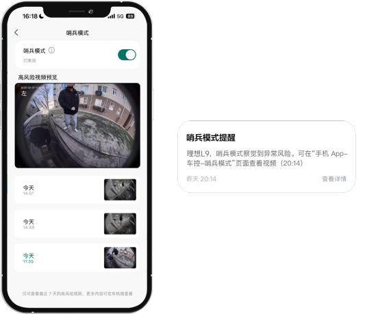 OTA7.1版本智能座舱主要围绕用车安全进行升级,新增手机远程预览哨兵高风险视频功能,在哨兵模式开启期间发生高风险事件,车辆会实时、主动推送预览视频至理想汽车App(理想汽车App需升级至8.2.0版本),用户可以通过理想汽车App回溯并下载近7天的高风险视频,并且视频会对外部信息进行脱敏处理,提升用户安全感的同时,保护他人隐私安全。