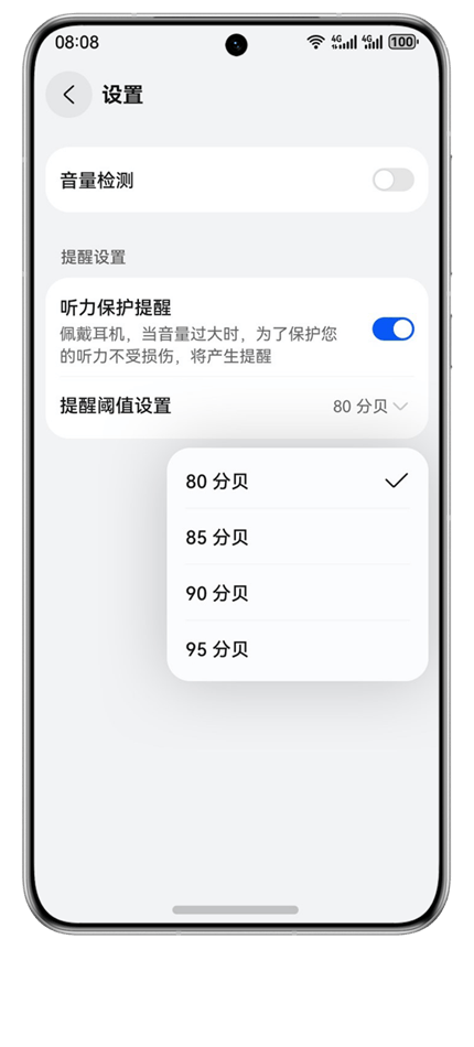 用户可以设置最大声压级安全阈值,当华为FreeBuds Pro 4的音量超过该值时,将主动进行提醒。华为FreeBuds Pro 4建议最大声压级不超过80分贝,并通过智慧生活APP提供实时音量分贝图,帮助用户了解当前音量水平。