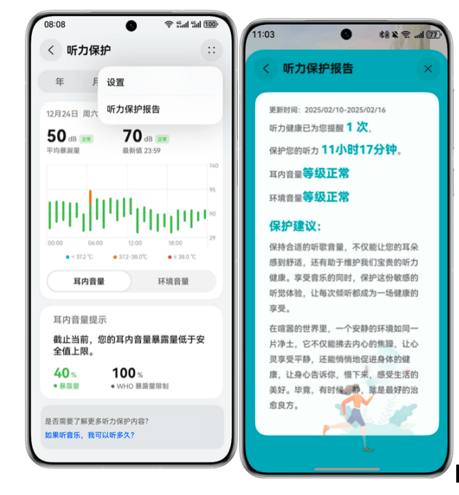 通过智慧生活App,用户还可以查看个人听力保护报告。报告详细呈现了用户的音量使用数据,并提供个性化的保护建议。这不仅让用户了解自己的用耳习惯,还能帮助他们及时采取措施,预防听力损伤。