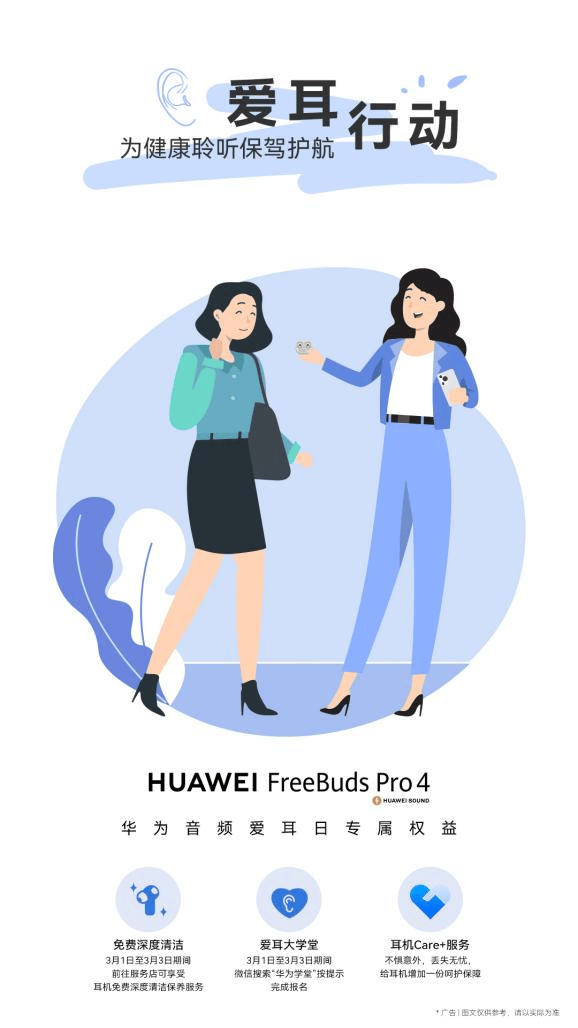 值此全国爱耳日来临之际,华为推出了一系列专属活动,旨在提升公众的听力保护意识,并为用户提供贴心的服务: 2025年3月1日-3月3日,用户可携带华为耳机前往全国华为客户服务中心,享受免费的清洁保养服务,保持耳机清洁,延长使用寿命。 华为每月的服务日,同样提供免费的耳机清洁保养服务。用户可通过“我的华为APP-服务-热门活动-服务日”查看详情。服务日时间为每月第一个连续的周五、周六、周日(如遇周末跨月,则顺延至下一个周末 例:2025年3月为7-9日)