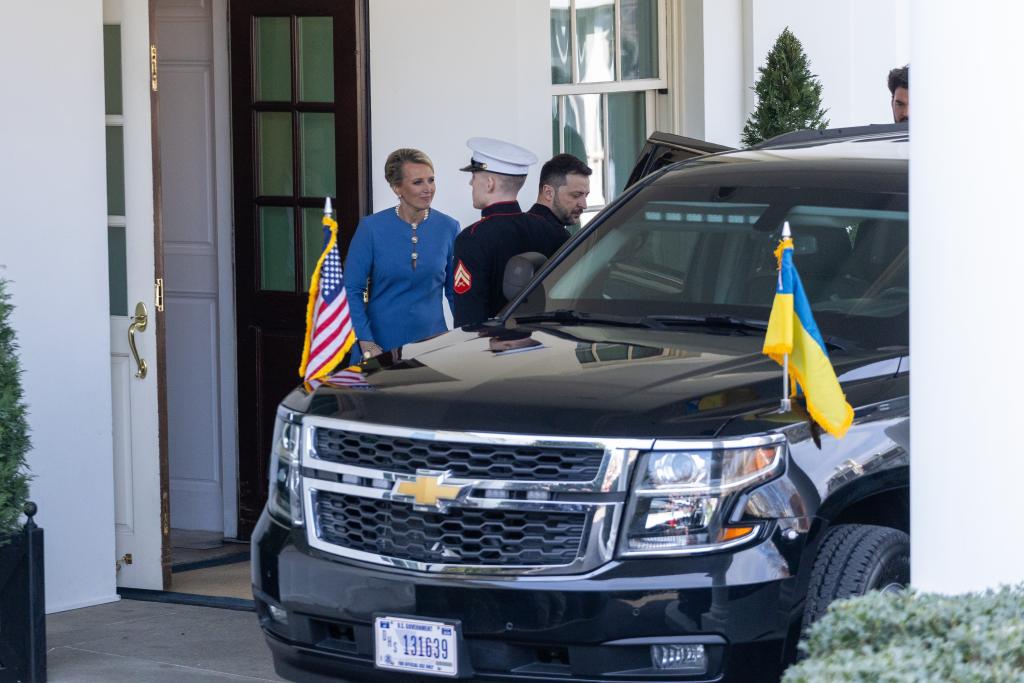 2月28日,乌克兰总统泽连斯基(左三)离开美国华盛顿白宫。