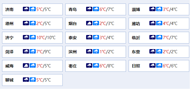 3日下午至4日白天,潍坊、济宁、枣庄、临沂、日照和青岛有雨夹雪转中雪局部大雪,鲁西北地区天气多云间阴局部有小雪,其他地区有小到中雪。