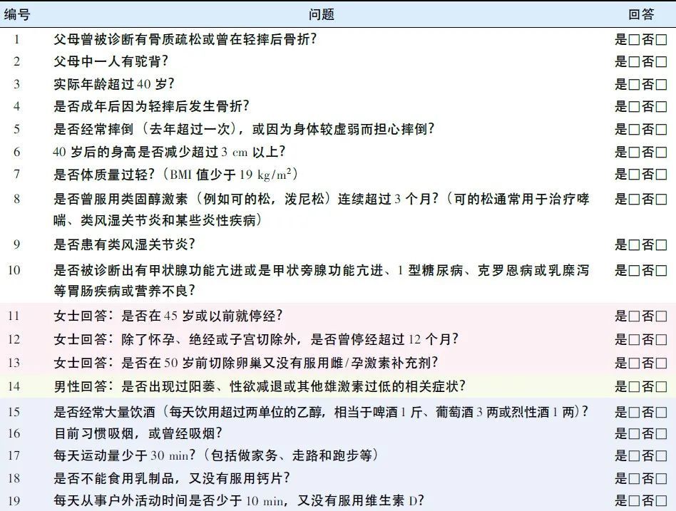 2017年中国的指南推荐了国际骨质疏松基金会(IOF)骨质疏松症风险一分钟测试题,下列问题中只要有1个以上问题你回答“是”,那么则提示存在骨质疏松症的风险,并建议到医院进行骨密度检查或骨折风险评估。