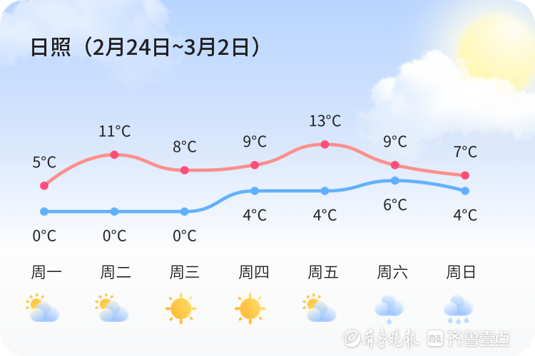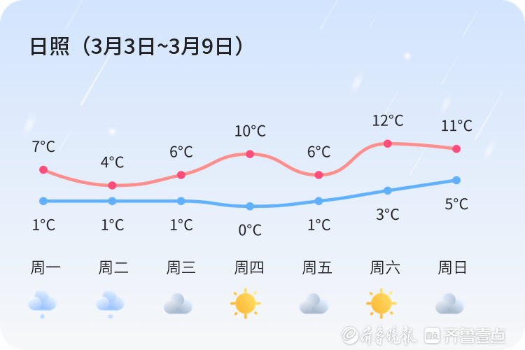 【3月3日,日照】一周天气小报来咯~~ 天气预报 2025-03-03 上周总体以阴、雨为主基调,可能还会有晴等天气。 上周气温变化情况: 最低气温0~6℃,最高气温5~13℃。空气质量方面总体良,几乎每天都是好空气! 具体气温变化情况如下图。 本周(3月3日~3月9日)预计接下来几天我市阴、雨天比较多,可能还会有晴等天气。具体天气情况请关注每日天气情况预告。 全市周平均最高温8℃,平均最低温1℃,平均气温4℃,周最高气温12℃,出现在周六,周最低温0℃,出现在周四。 具体气温变化情况如下图。