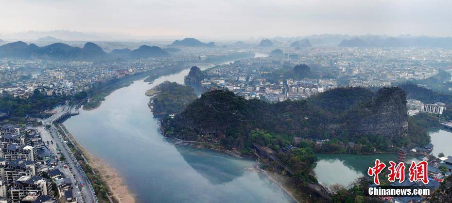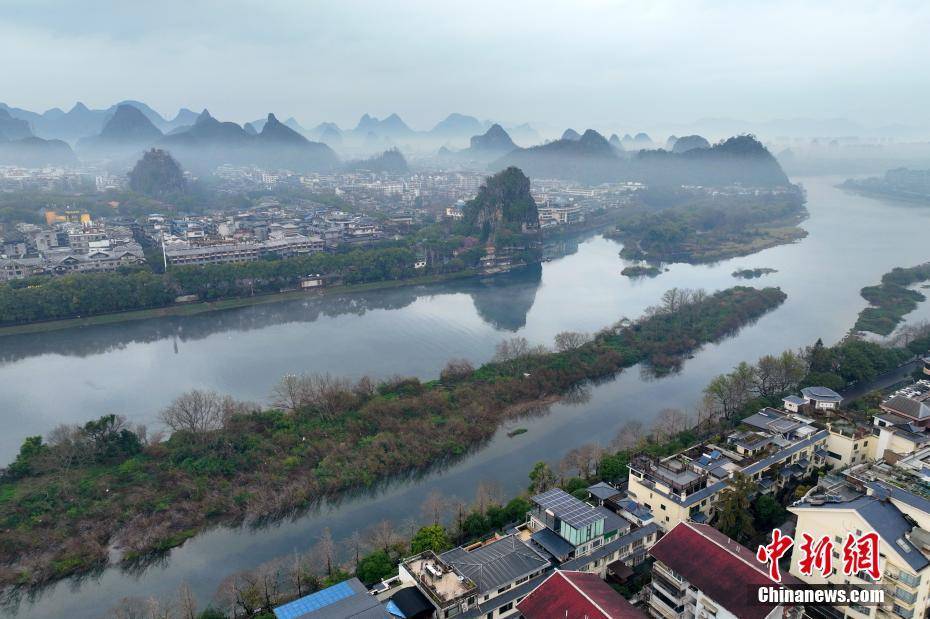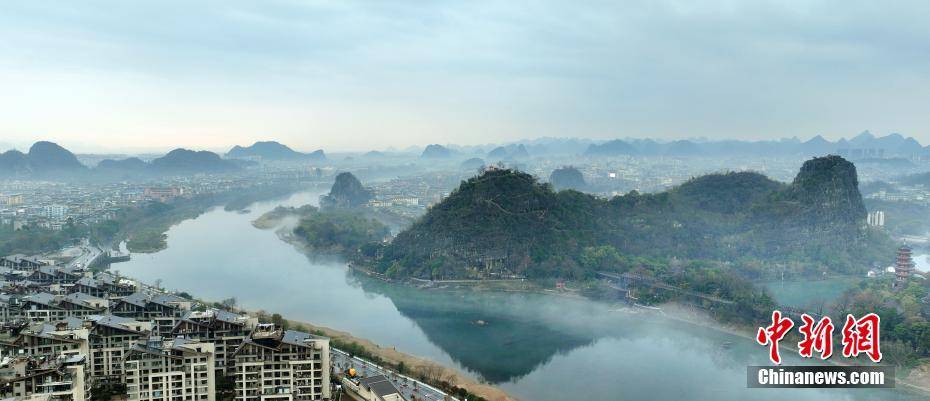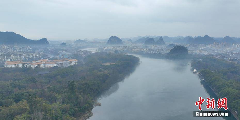 3月2日,薄雾环绕着桂林市区漓江段,整个桂林城笼罩在一层薄雾中,现烟雨桂林美景。图为薄雾环绕的桂林市区漓江段。(无人机照片)李腾钊 摄