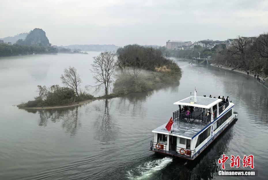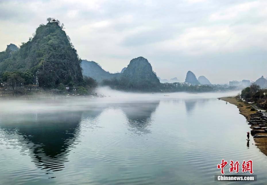 3月2日,薄雾环绕着桂林市区漓江段,整个桂林城笼罩在一层薄雾中,现烟雨桂林美景。图为薄雾环绕的桂林市区漓江段。李腾钊 摄