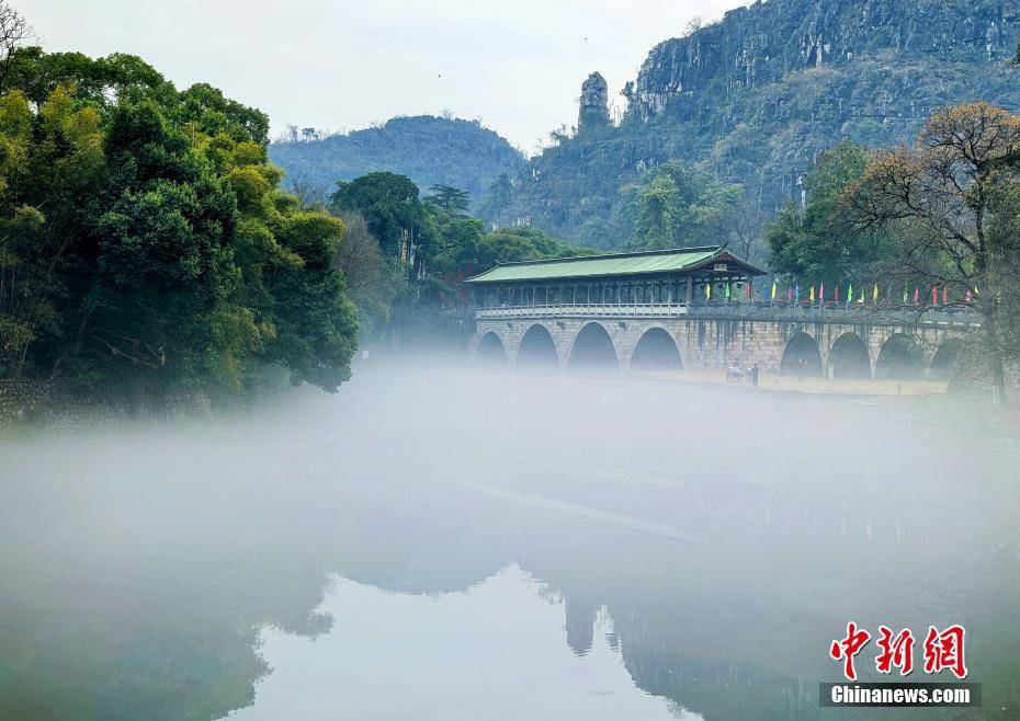 3月2日,薄雾环绕着桂林市区漓江段,整个桂林城笼罩在一层薄雾中,现烟雨桂林美景。图为薄雾环绕着桂林七星公园花桥。李腾钊 摄