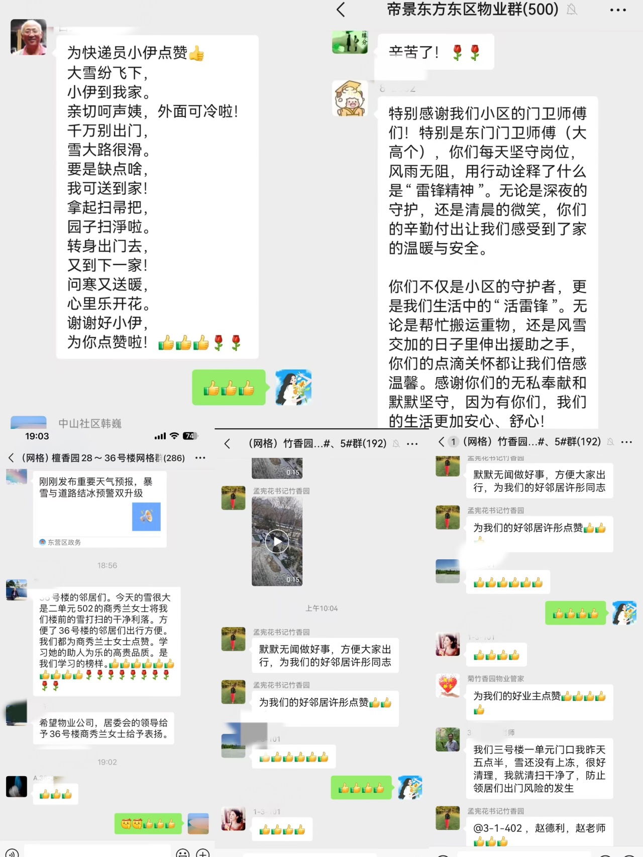 在扫雪过程中,还涌现出了许多感人的瞬间。帝景东方小区的门卫师傅,他不仅坚守岗位,还主动帮助邻居清扫积雪,被居民们亲切地称为“大家生活中的活雷锋”。桂香园的李大爷,则用一首小诗表达了对冒雪送快递的伊伟利的感激之情,让这份温情在冬日里传递得更远。竹香园党支部书记孟宪花,更是小区里的大事小事都冲在前面,她的无私奉献精神赢得了居民们的纷纷点赞。还帝景东方小区报到党员郑翠玲、檀香园热心居民商秀兰、竹香园小区“好邻居”许彤、“小区能人”赵德利老师,他们用实际行动诠释了“邻里守望相助”的深刻内涵。(大众新闻记者 赵军 通讯员 李家慧)