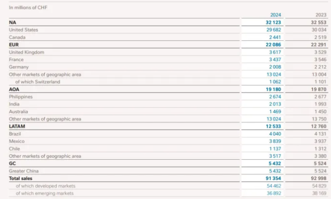 从区域情况看,雀巢大中华市场(GC)2024年销售额54.32亿瑞士法郎,比2023年少了0.92亿瑞士法郎,降幅为1.66%,要低于雀巢集团的全球平均降幅。有分析认为,大中华市场增速低于全集团,与以徐福记为代表的糖果业务收入增长有关。