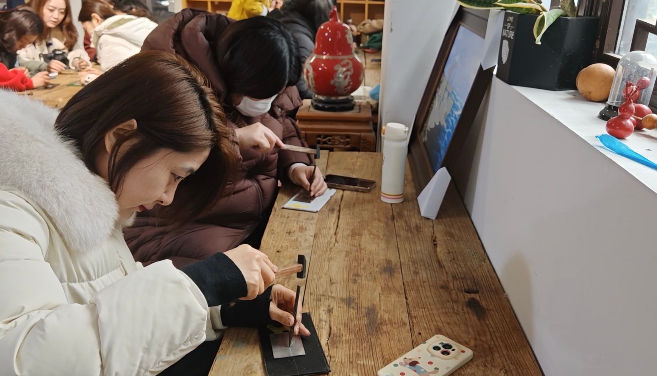 活动中,非遗传承人详细讲解锡镶技艺作为威海独有的传统手工艺的历史渊源,示范锡镶技艺的“雕刻、镶嵌、抛光”工序。女职工们仔细聆听,耐心观察,一锤一錾,感受锡镶工艺的精妙。