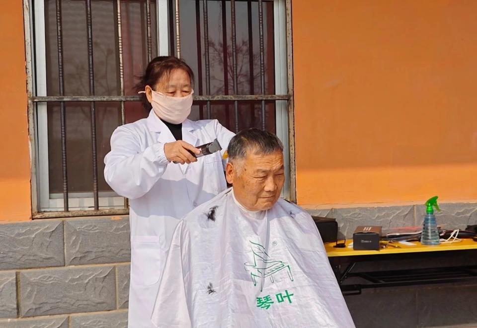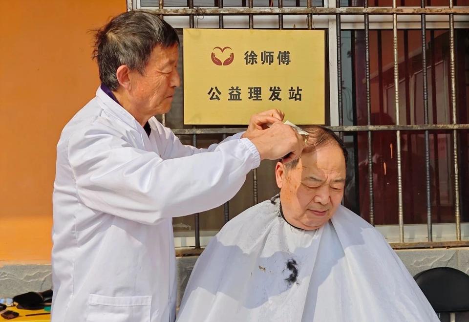 午后时分,阳光明媚,许多老年人已经早早地来到这里排队等候理发。理发师徐衍辉师傅一手拿着梳子,一手握着剪刀,动作轻柔而利落,不一会儿就为一位老人理好了清爽利落的发型。徐师傅一边理发,一边和老人唠着家常,从天气变化聊到家长里短,逗得老人开怀大笑。