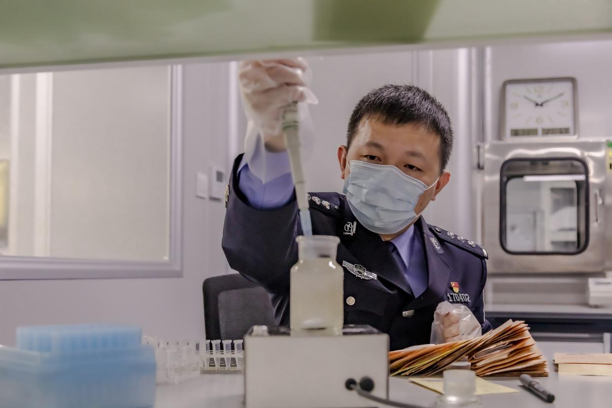 柯伟力采集新四军战士刘金山的骸骨样本 路桥公安供图