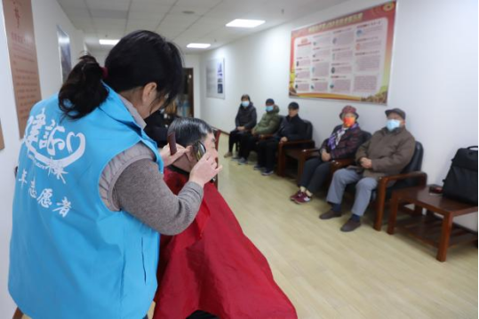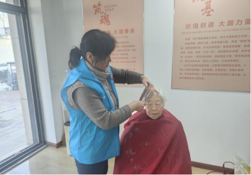 一把椅子、一块围布、几件理发工具组成了一个临时理发区,志愿者为行走不便的老年人提供“上门式”免费理发服务,让大家感受到了企业的关怀和温暖。