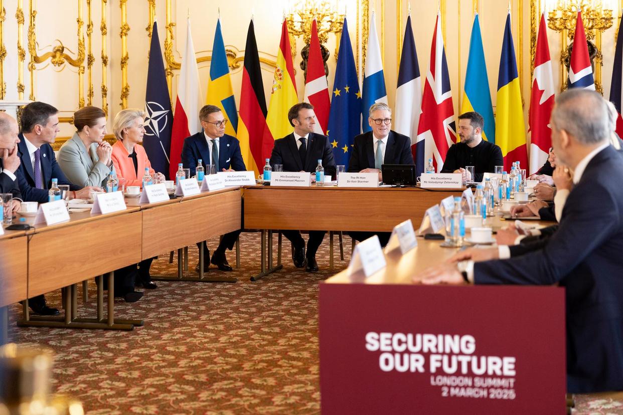 这是3月2日在英国首都伦敦拍摄的峰会现场。十余个欧洲国家以及乌克兰和加拿大的领导人2日在伦敦举行峰会,就乌克兰危机和欧洲防务问题进行讨论。新华社发(英国首相府供图)