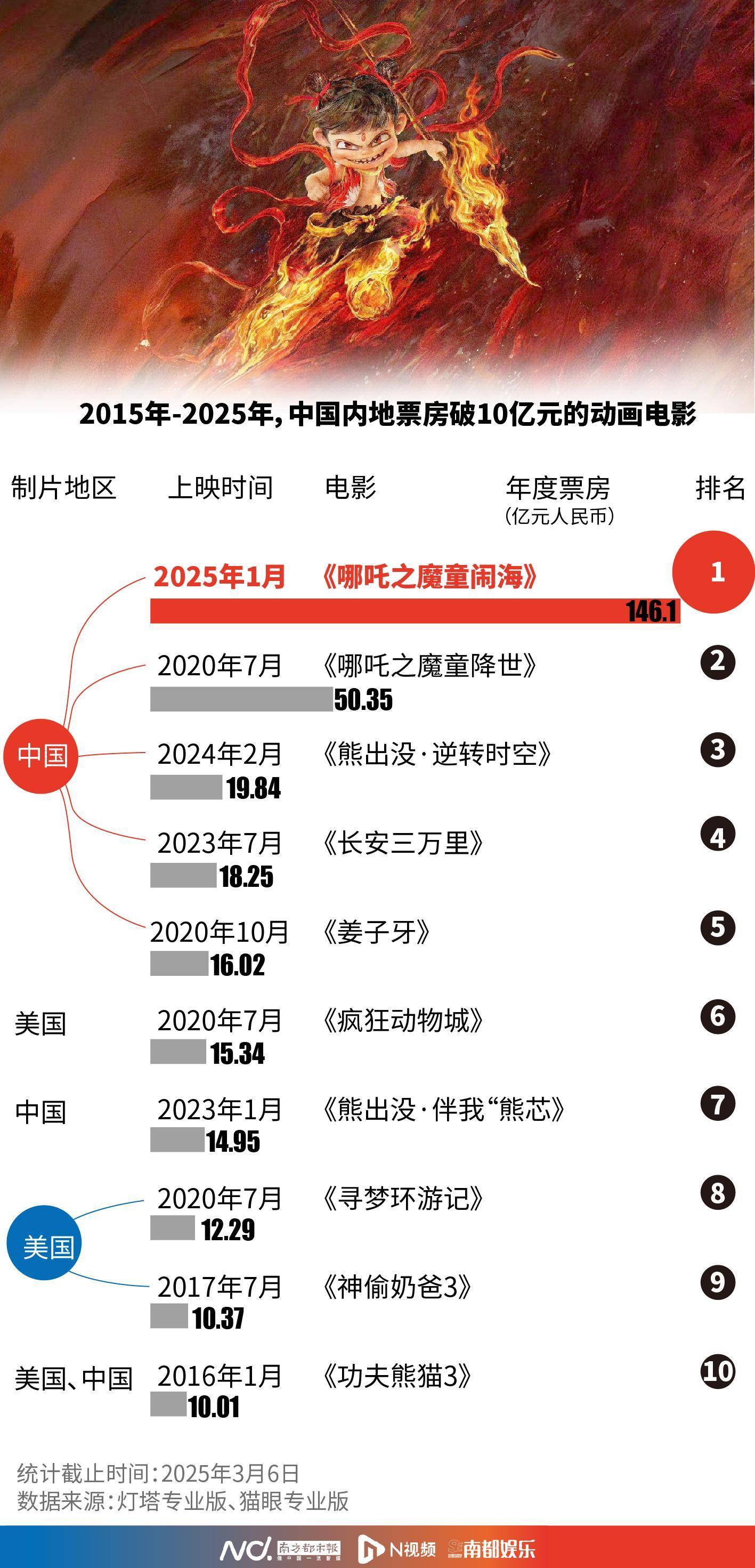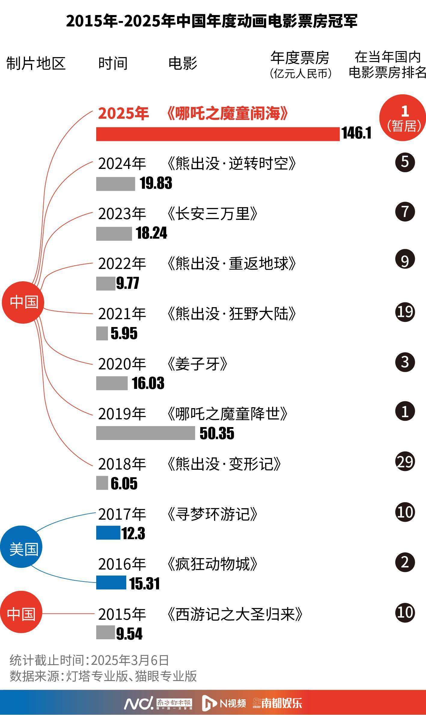 2015年,《大圣归来》在暑期档收获9.54亿票房;10年后的2025年,《哪吒2》冲刺150亿票房目标。十年来我国动画电影票房冠军都有谁?南都记者特意梳理了相关数据。