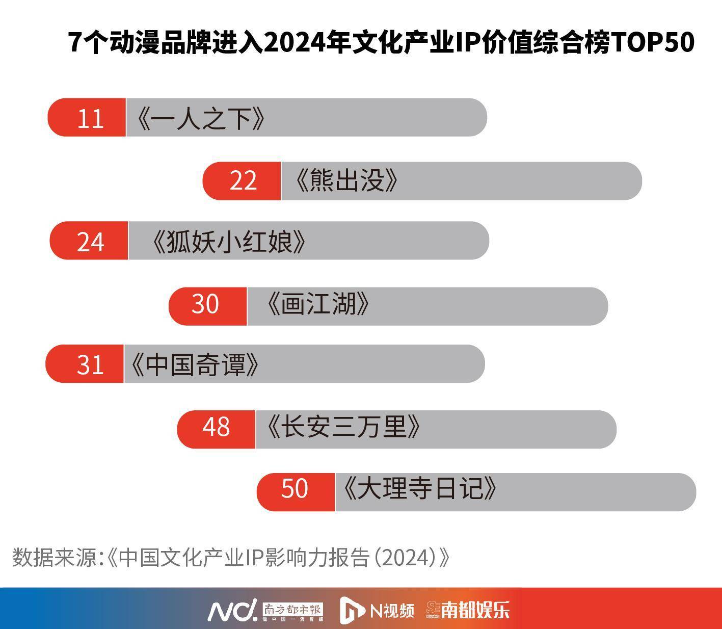 据南都记者观察,在去年年底发布的《中国文化产业IP影响力报告(2024)》中,《熊出没》便作为国漫的代表,登上价值综合榜前50。