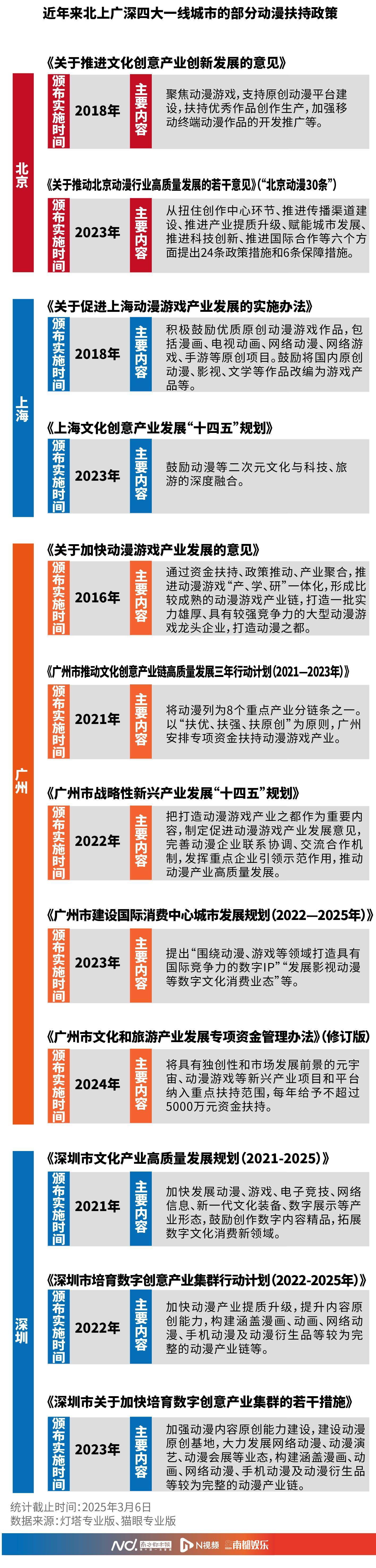 2023年,《关于推动北京动漫行业高质量发展的若干意见》(简称“北京动漫30条”)出台,主要内容是从扭住创作中心环节、推进传播渠道建设、推进产业提质升级、赋能城市发展、推进科技创新、推进国际合作等六个方面提出24条政策措施和6条保障措施。广州多措并举,明确提出打造动漫之都。上海也鼓励二次元文化与科技、旅游深度融合。深圳则提出发展完整的动漫产业链。