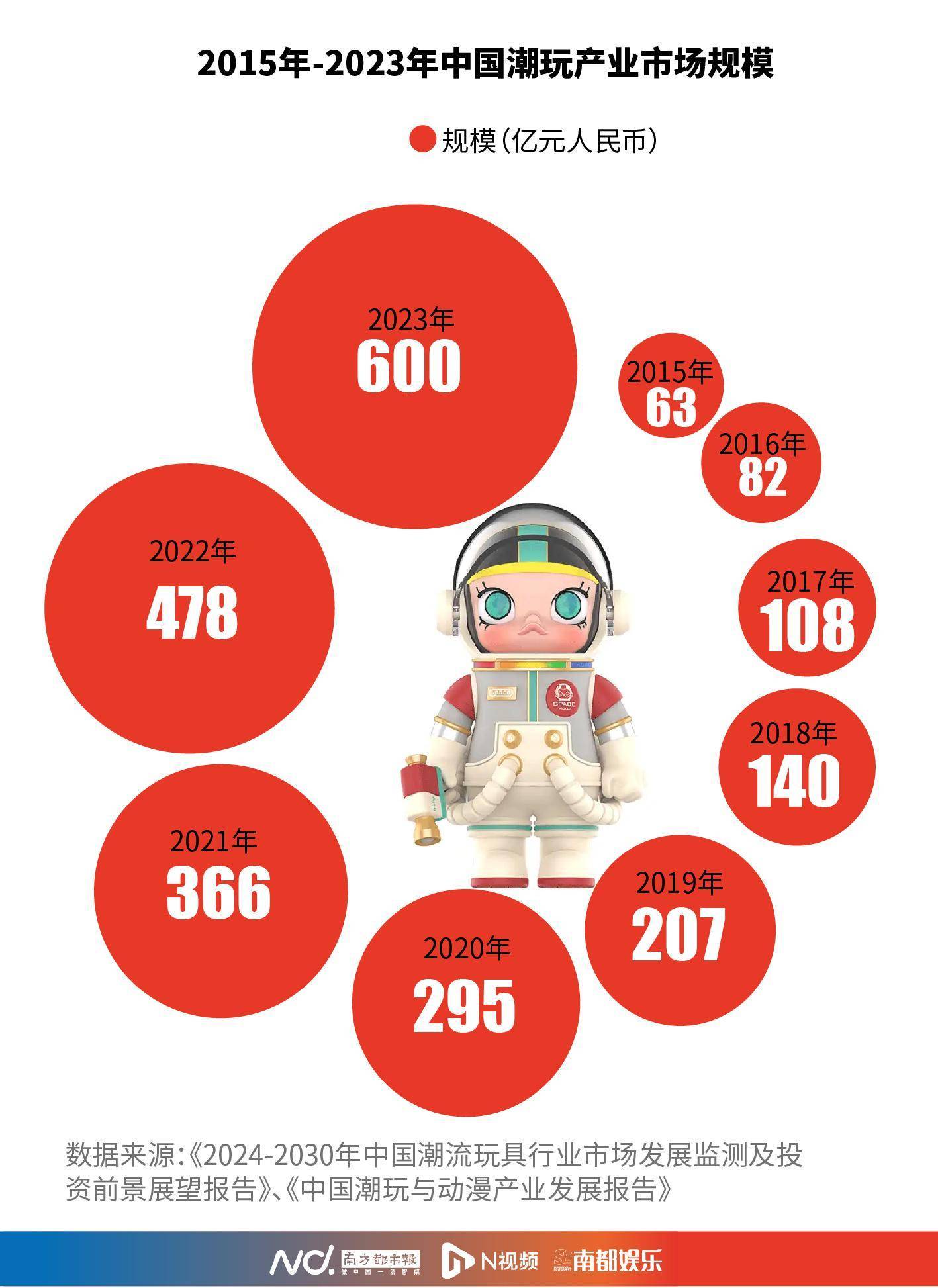 南都记者梳理行业报告发现,近年来,中国潮玩产业进入快速增长期。从产业规模来看,2023年中国潮玩产业的市场总价值约为600亿元,占全球潮玩市场的20%左右。从增长趋势来看,中国潮玩产业的市场规模从2015年的63亿元增长到2021年的345亿元,复合年均增长率达33%。相关报告更预估,中国潮玩产业的市场规模在2026年将达到1101亿元。