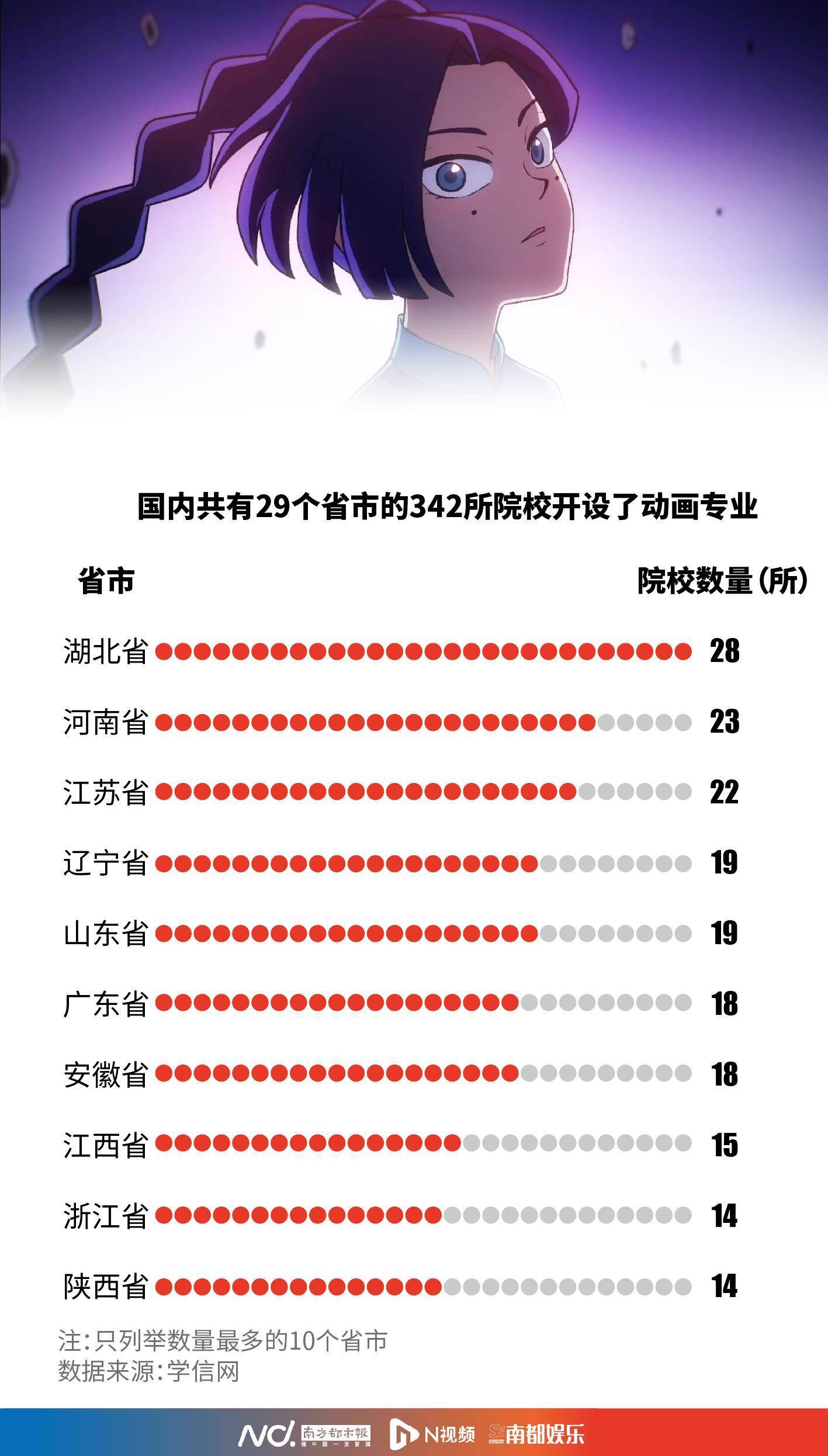 南都记者梳理了相关数据,截至发稿时,国内共有29个省市的342所院校开设了动画专业。其中,湖北省最多,有28所院校开设了这个专业,紧随其后的是河南省与江苏省。而广东省则有18所院校开设了动画专业。