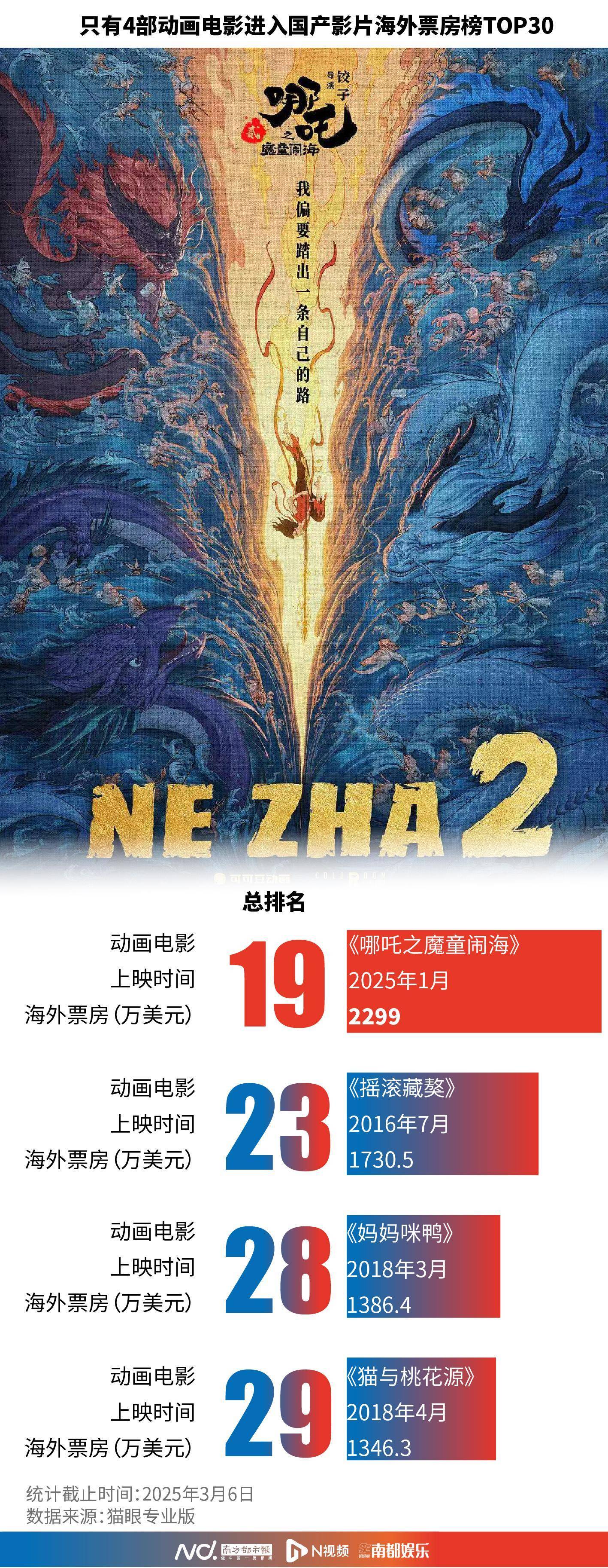 数据显示,只有4部动画电影进入国产影片海外票房榜TOP30,即便是已登上全球动画电影票房榜首位的《哪吒2》,截至发稿时海外票房也只有2299万美元,排名该榜第19位,离榜首的《卧虎藏龙》还有近2亿美元的差距。可见,《哪吒2》98%以上的票房依旧来自中国内地。