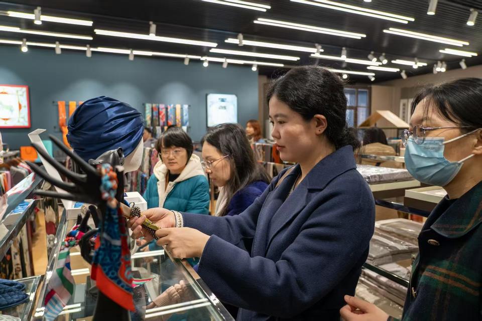 观丝绸智造,触摸“指尖上的国潮”。随后,大家走进中国丝绸行业标杆企业——淄博大染坊丝绸集团有限公司。作为全国唯一一家实现缫丝、织造、练印染、家纺制品、文化创意产品、服装服饰、国内外贸易完整产业链的丝绸生产贸易企业,其智能化生产与非遗工艺的深度融合令大家赞叹不已,女干部职工们深刻感受到传统丝绸产业在科技赋能下的转型升级,以及国潮品牌在“她经济”消费新赛道中的独特魅力。活动期间,大家还围绕丝绸产品设计、品牌营销等展开交流,为助力消费提质扩容建言献策。