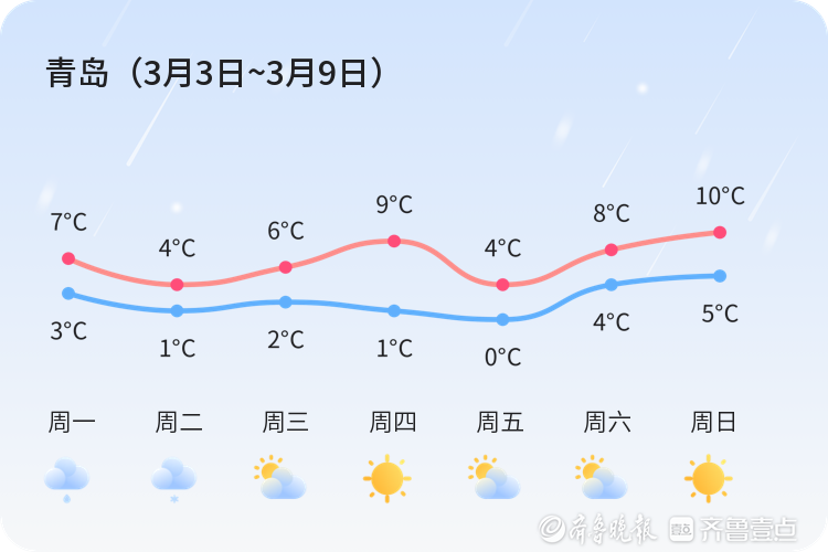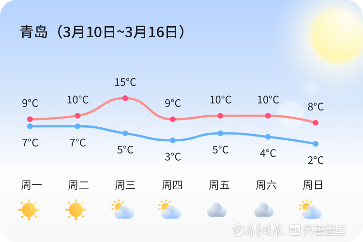 【3月10日,青岛】一周天气小报来咯~~ 天气预报 2025-03-10 1126 上周(3月3日~3月9日)我市晴、多云天比较多,可能还会有雨等天气。 全市周平均最高温6℃,平均最低温2℃,平均气温4℃,周最高气温10℃,出现在周日,周最低温0℃,出现在周五。 具体气温变化情况如下图。 本周总体以晴、多云为主基调,可能还会有雨、阴等天气。具体天气情况请关注每日天气情况预告。 本周气温变化情况: 最低气温2~7℃,最高气温8~15℃。 需要关注及时最新预报。 具体气温变化情况如下图。