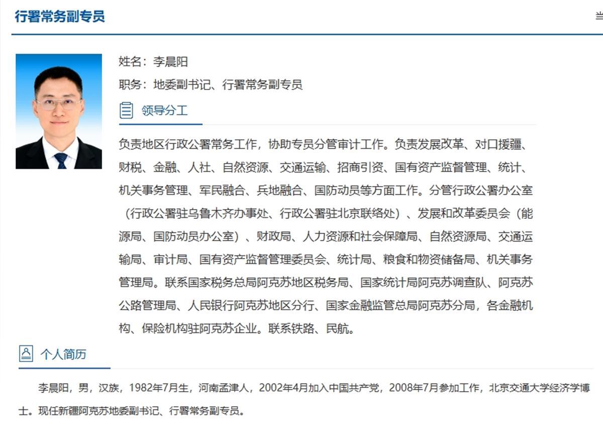 阿克苏地区行政公署官网介绍,李晨阳,男,汉族,1982年7月生,河南孟津人,2002年4月加入中国共产党,2008年7月参加工作,北京交通大学经济学博士。