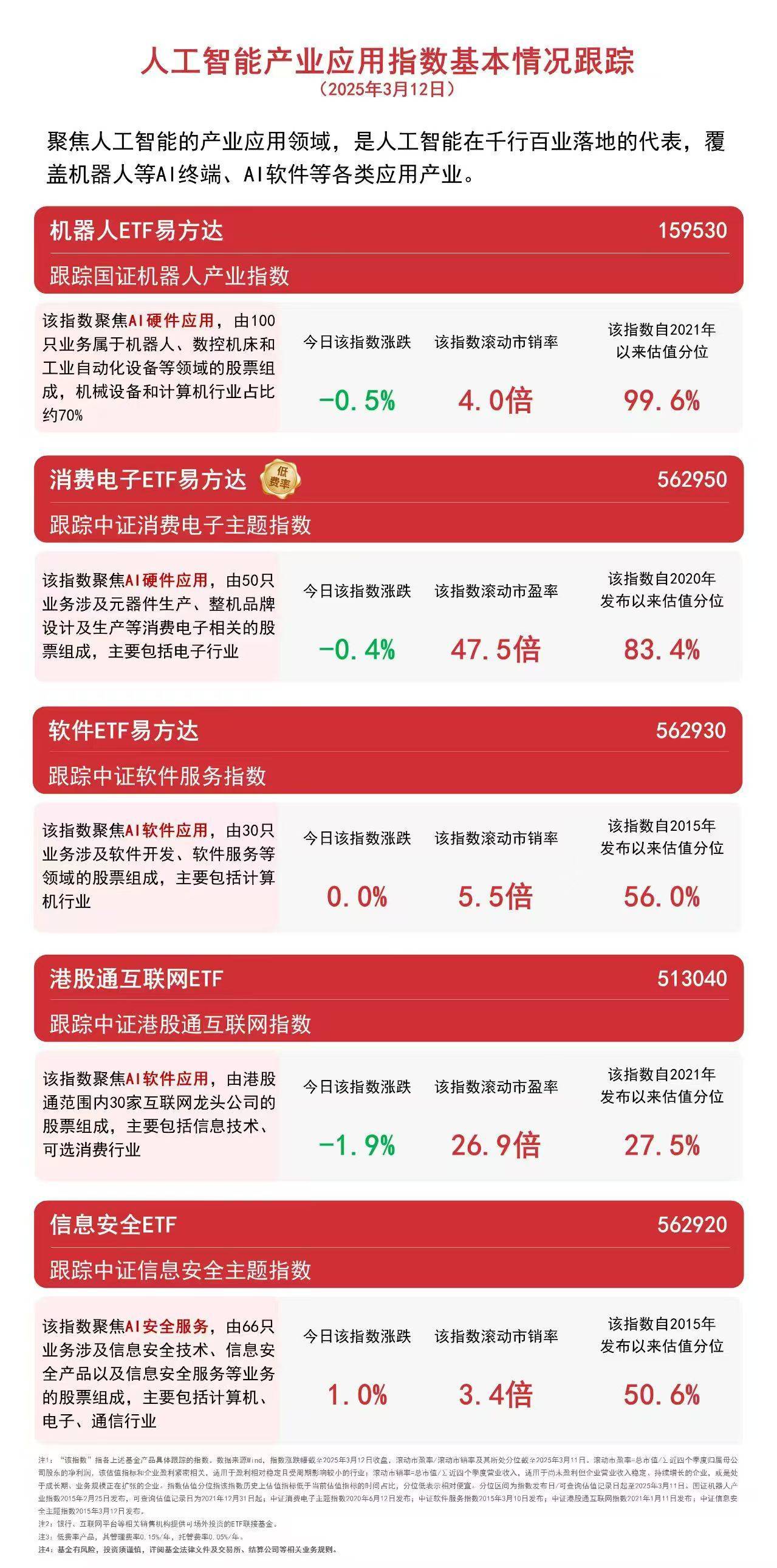 截至收盘,中证信息安全主题指数上涨1.0%,中证软件服务指数上涨0.01%,中证消费电子主题指数下跌0.4%,国证机器人产业指数下跌0.5%,中证港股通互联网指数下跌1.9%。